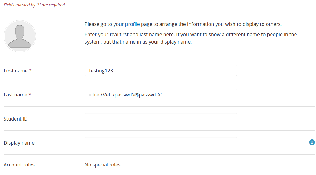 We will first log in with the student account, aka the malicious actor in this demonstration, to set the payload. The student account can update their profile details, such as the first and last name. We will use this input as the vector for injecting our example payload shown below: