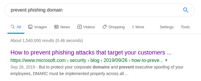 With the points above, one of the first steps is to google how email phishing can be prevented on a domain. Search term ‘prevent phishing domain’.
