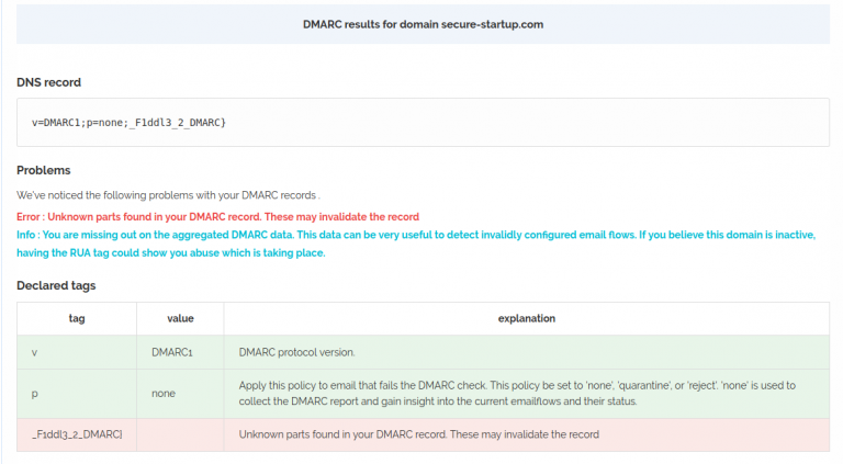 After googling ‘DMARC record lookup’ I came across dmarcanalyzer.com which gave the following information: