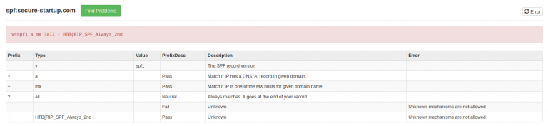 With the information above, we can identify two valid tags, however there is an unknown tag that possibly looks like second half of a flag due to ‘}’ ending, we will store this for now in our notes. With no other information left to extract from DMARC results, we will now do a SPF record check and see what information may be available to use there.