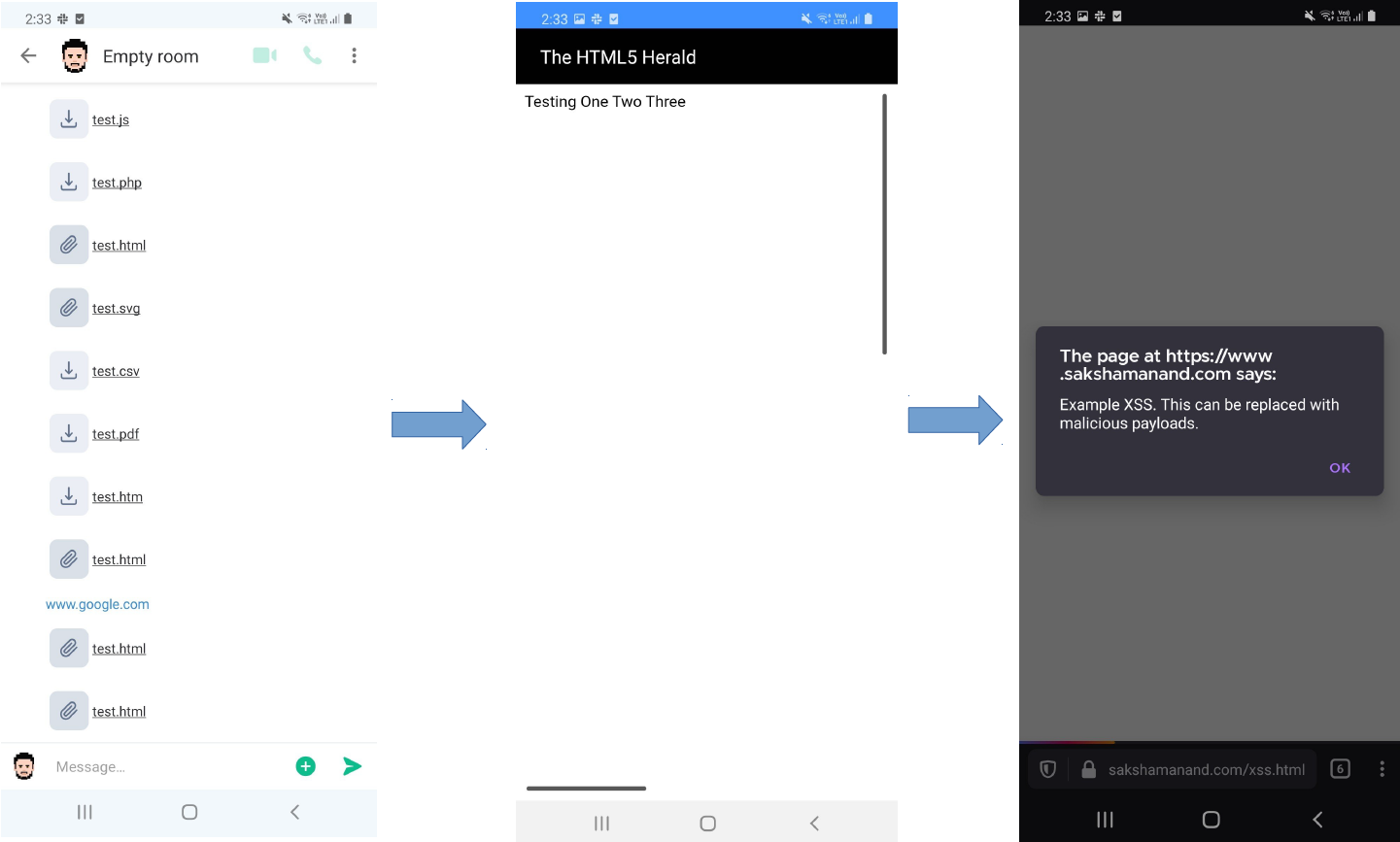 Depending on the device and it’s setting, a variety of actions can trigger; the file may automatically download and open on click, the actual extension of the file can be hidden (a user may think they are downloading a pdf file, when in fact it may be app package) and so on. - The payload target can be replaced with Android Deep Link URLs, some which accept body content. For example “example://sakshamanand?data=malciousContent” can allow for stacked vulnerabilities, if the target application contains this type of behaviour.