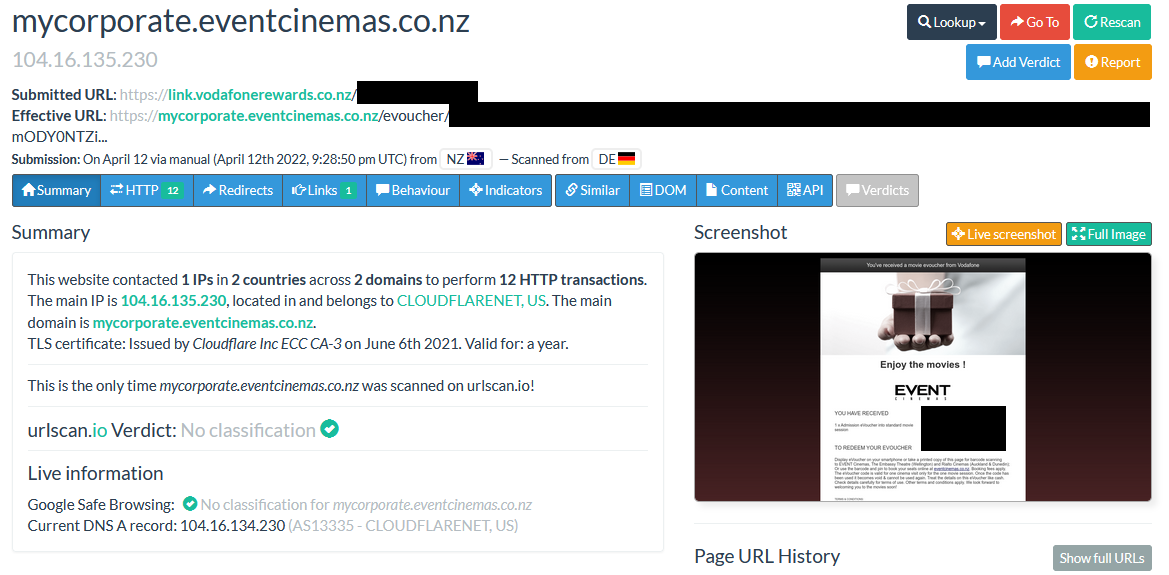 Use case one: Manual submissions. Consider the screenshot below, there are two main properties to note, submitted URL and effective URL. A user has submitted a short link from their Vodafone Rewards site (submitted URL), which has then redirected to a unique URL (effective URL) containing a free movie ticket. This information is now available on the Internet for anyone to use, unless the user gets this removed from urlscan.io (unlikely that the user is aware of the scan being public in first place).
